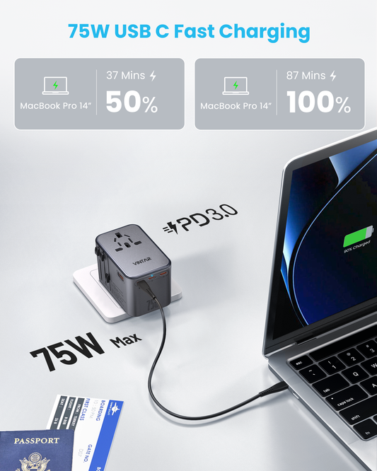 Universal Travel Adapter, VINTAR 75W GaN International Plug Adapter with 3 USB-C PD & 2 USB-A QC, All-in-one Travel Essentials for UK/EU/USA/AUS, Travel Adapter Worldwide for Laptops Phones, Grey