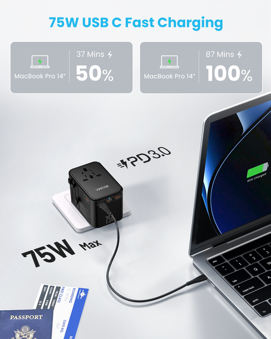 Universal Travel Adapter, VINTAR 75W GaN International Plug Adapter with 3 USB-C PD & 2 USB-A QC, All-in-one Travel Essentials for UK/EU/USA/AUS, Travel Adapter Worldwide for Laptops Phones, Black