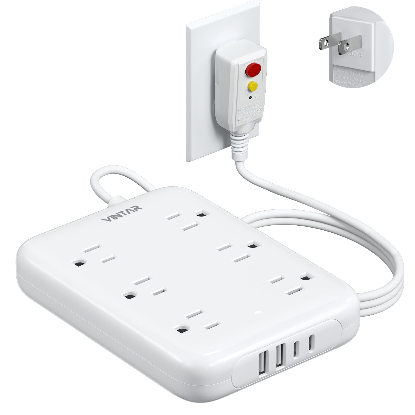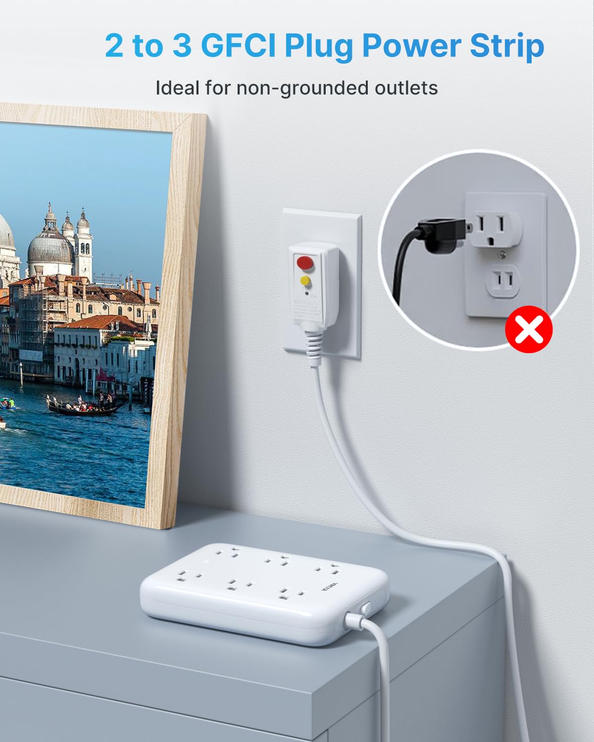 2 Prong GFCI Power Strip, VINTAR 2 Prong to 3 Prong GFCI Plug Adapter, 6ft Extension Cord with 6 Outlets & 4 USB(2 USB-C), 1050J Surge Protector, Polarized Plug Wall Mount for Non-Grounded Outlet