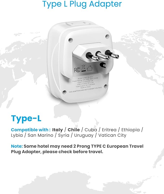 - [US to Italy plug adapter] This italy power adapter is compatible in overseas countries such as Italy, Chile, Cuba, Eritrea, Ethiopia, Lybia, San Marino, Syria, Uruguay, Vatican City (Note: Some hotel may need 2 Prong TYPE C European travel plug adapter, please check before travel).
