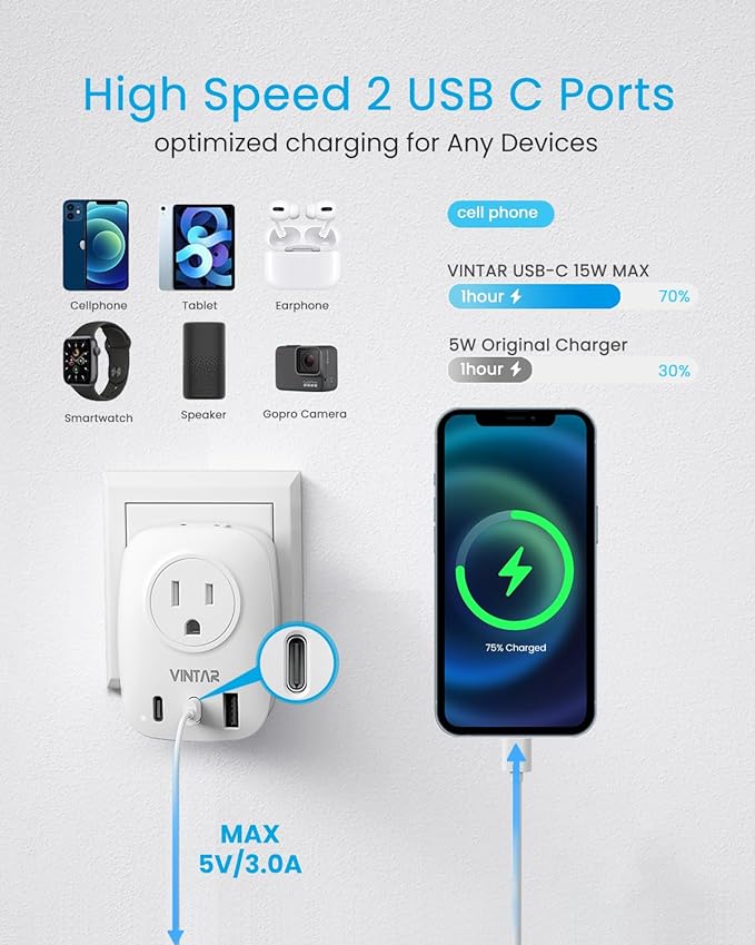 - [Fast Charging Dual USB-C Ports] The upgraded plug adapter for italy accepts standard American 2 and 3 prong flat pin Plugs and 3 USB devices. USB A port charging up to 2.4A(12W), dual USB C port charging up to 3A(15W), owing you charge 5 devices at a higher rate simultaneously, no need to carry extra adapter and power strip for your traveling. Ideal for Cell Phone, iPad, Kindle, Laptop, GoPro, Camera, Power Ban, etc.